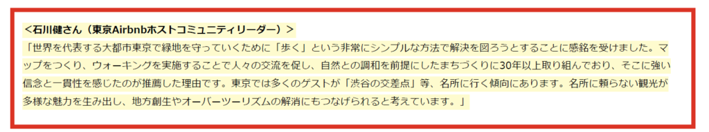 今回選ばれたNPO法人みどりのゆびについて、推薦者である当会代表の石川が喜びの声としてAirbnbのプレスリリースで紹介されています。
